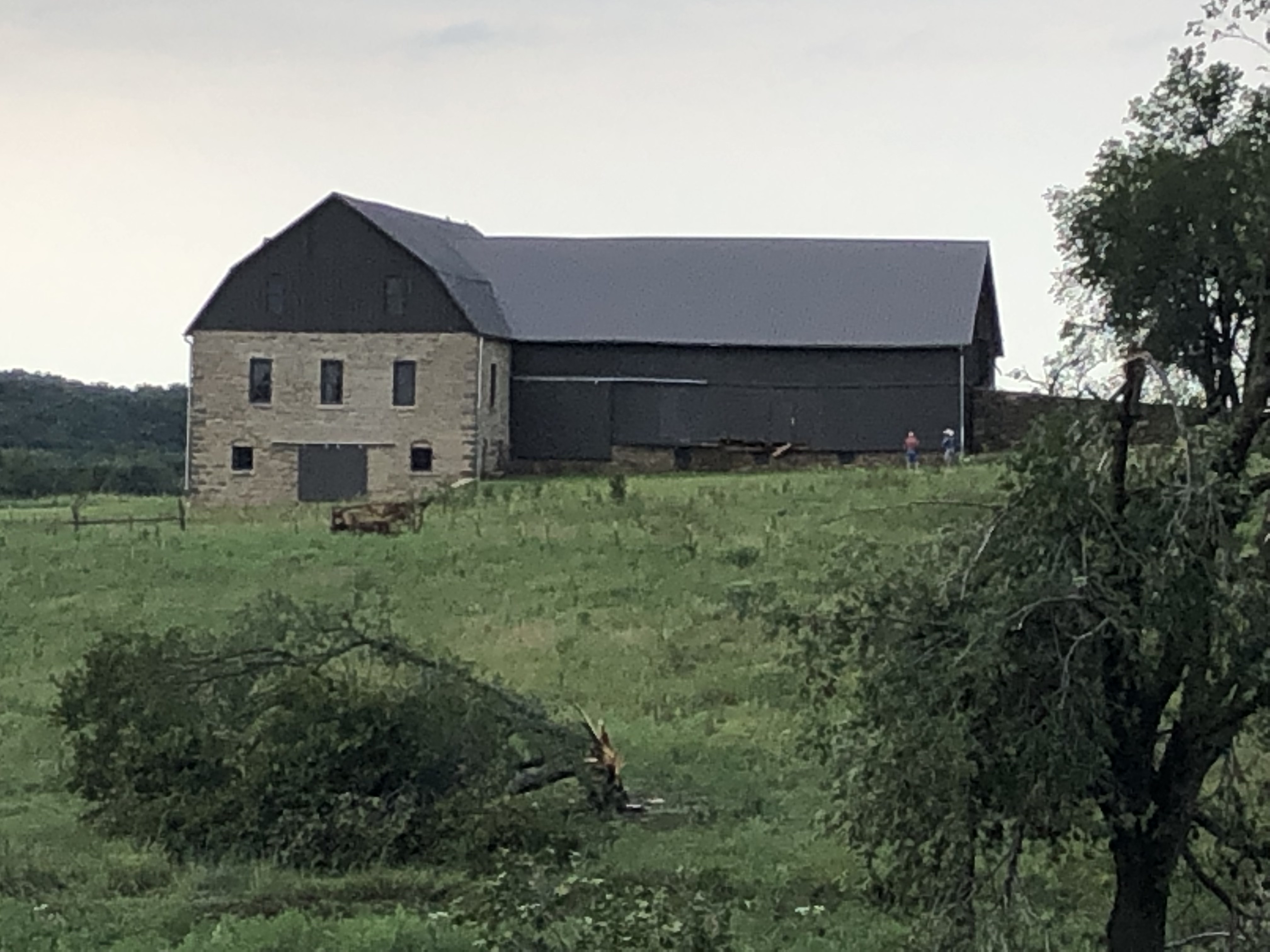 Damage from an August 15, 2019 tornado was limited to the north wall of the granary on the massive Schepp barn. (Image courtesy Abby Amick)