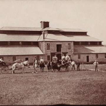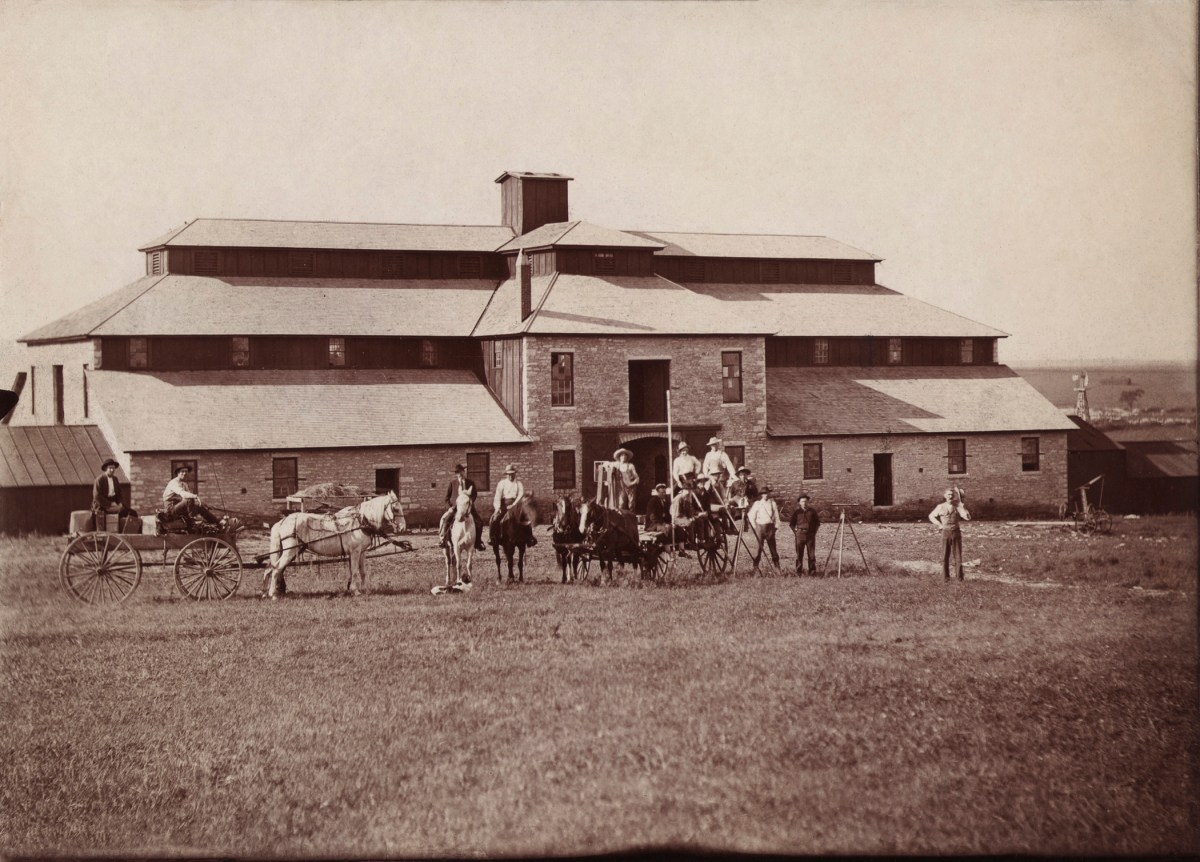 A group of railroad surveyors are photographed in front of the Wiser barn, circa 1886. Notice that by this time, the windmill had disappeared from the roof, and the roof itself had been replaced. (Image courtesy the Ellen Coffman Collection courtesy Michael Stubbs)