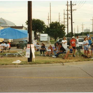 Spouses and children joined their Teamster family member on the strike lines in front of the Topeka UPS center in this view from August of 1997.