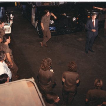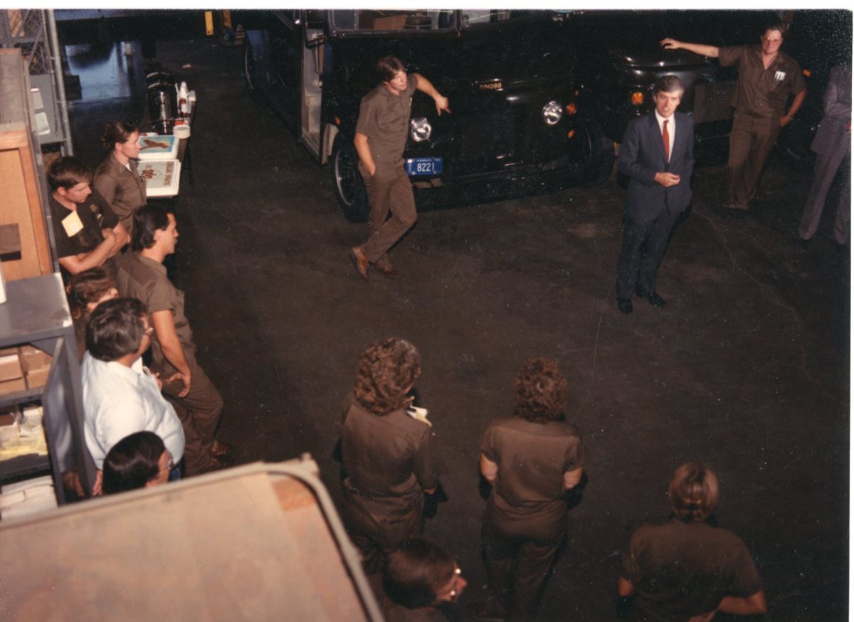 Congressman Slattery speaks to a group of drivers and UPS workers on Founders’ Day, 1987.