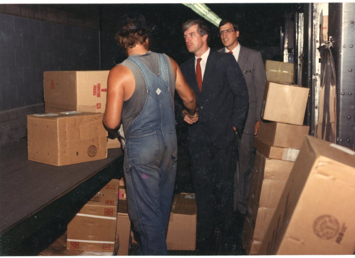 Congressman Jim Slattery meets with a UPS preloader as packages move down the conveyor at the UPS package car center in Topeka.