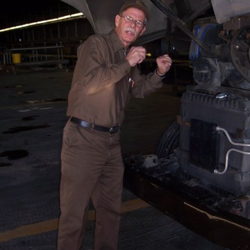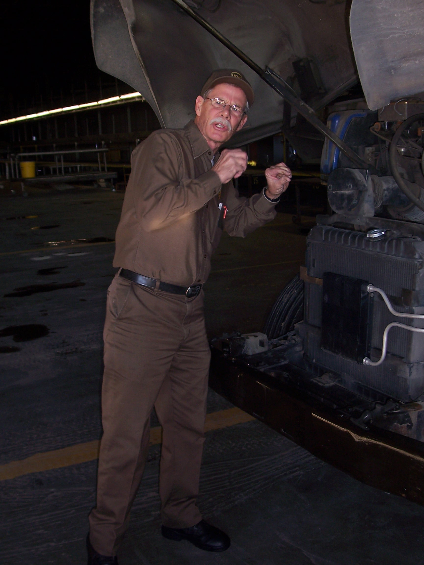 UPS package car driver, Tom Shehi checks the oil on his package car on his final day of work before retirement.