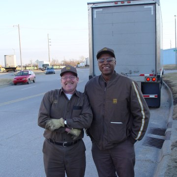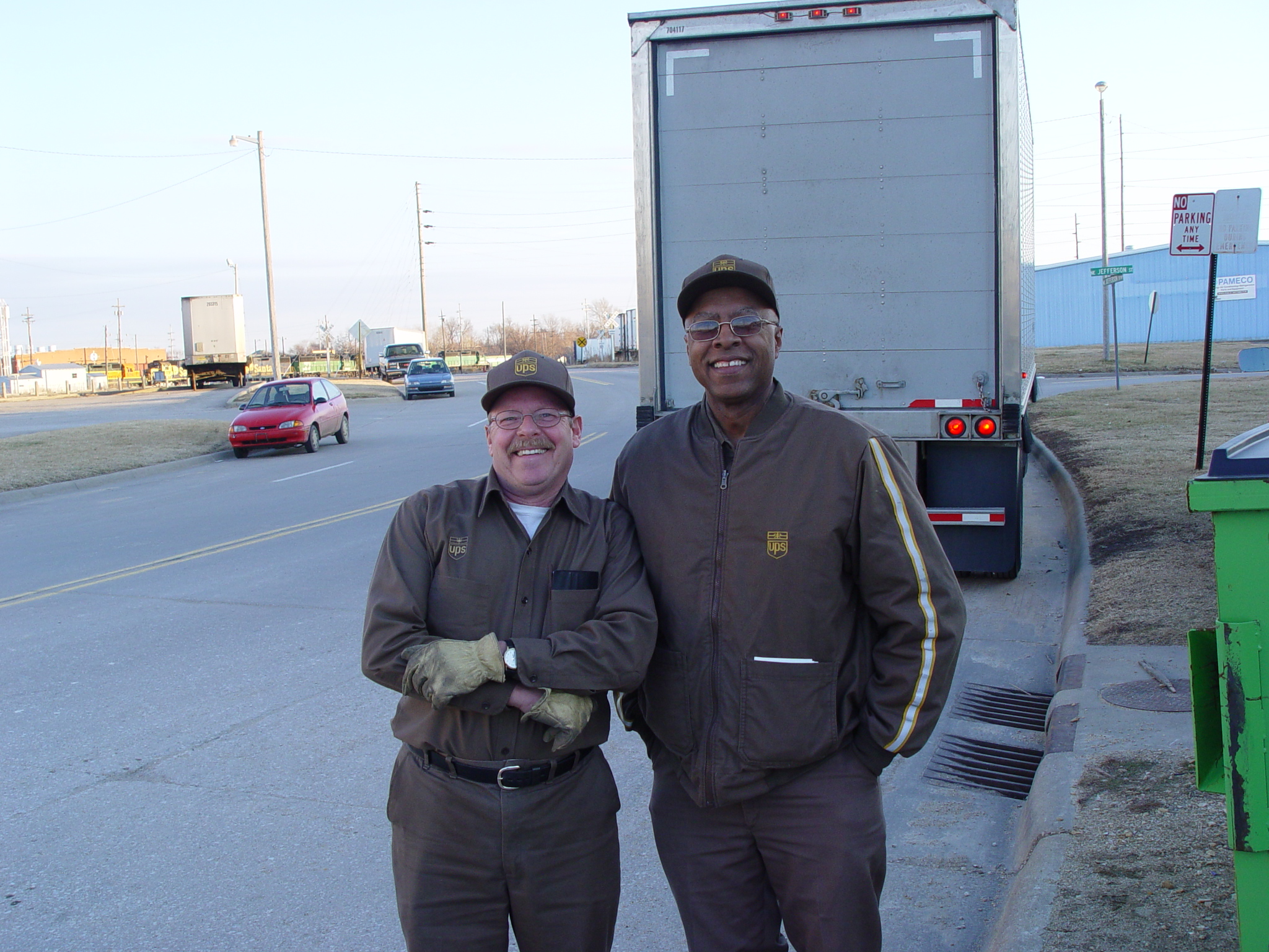 Bob Kramer, left, and Clarence Banks, both longtime Topeka feeder drivers, pause behind a trailer parked along the east side of the UPS building in Topeka.