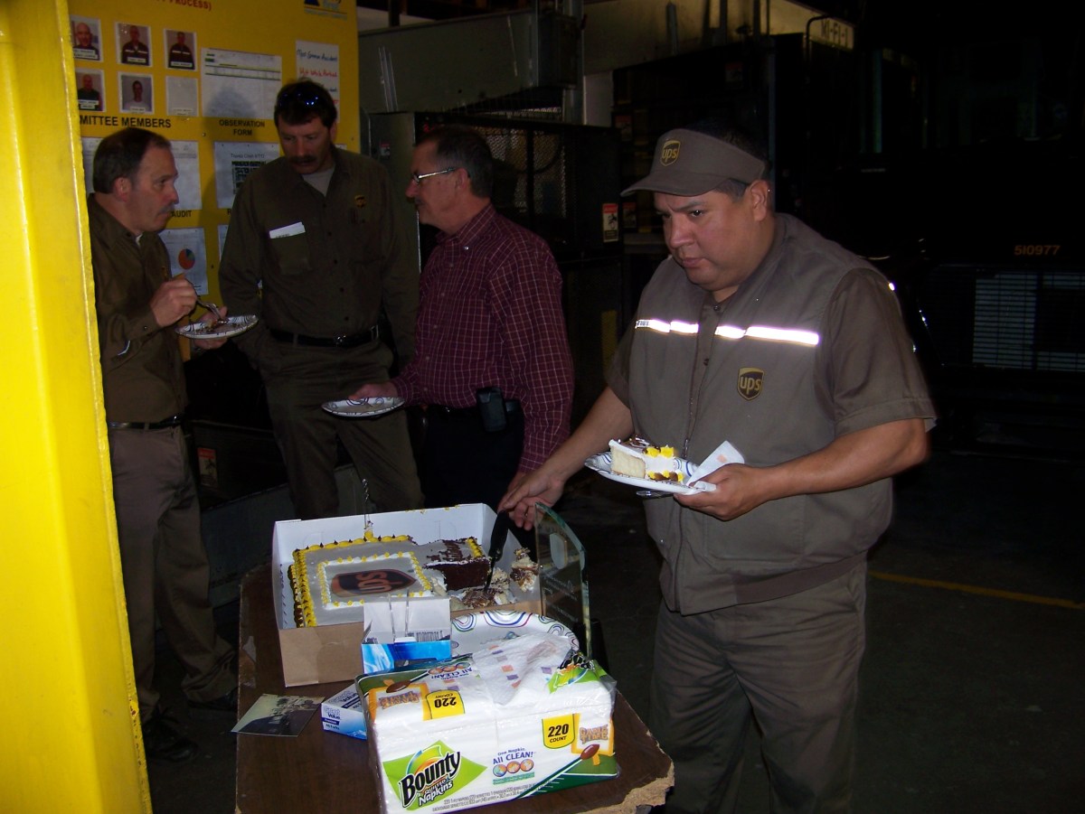 UPS employees, (left to right), Jim Figgs, Lynn Thompson, Dave Brown, and Bobby Munoz share a piece of cake on Christmas Eve, 2012, celebrating the retirement of Greg Hoots.
