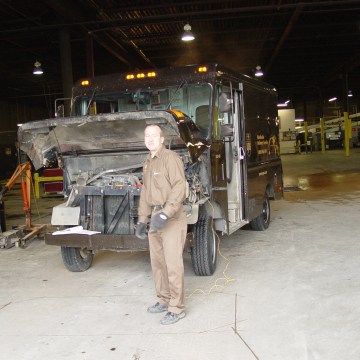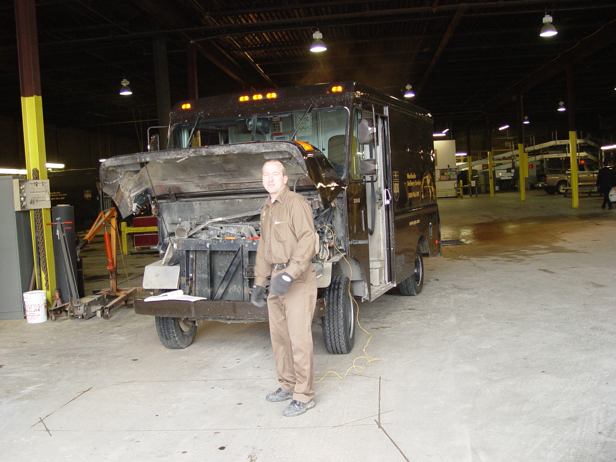 This photo was taken on a Monday. Package car driver, Steve Hewitt attempts to start a P32 package car inside the Topeka package center.