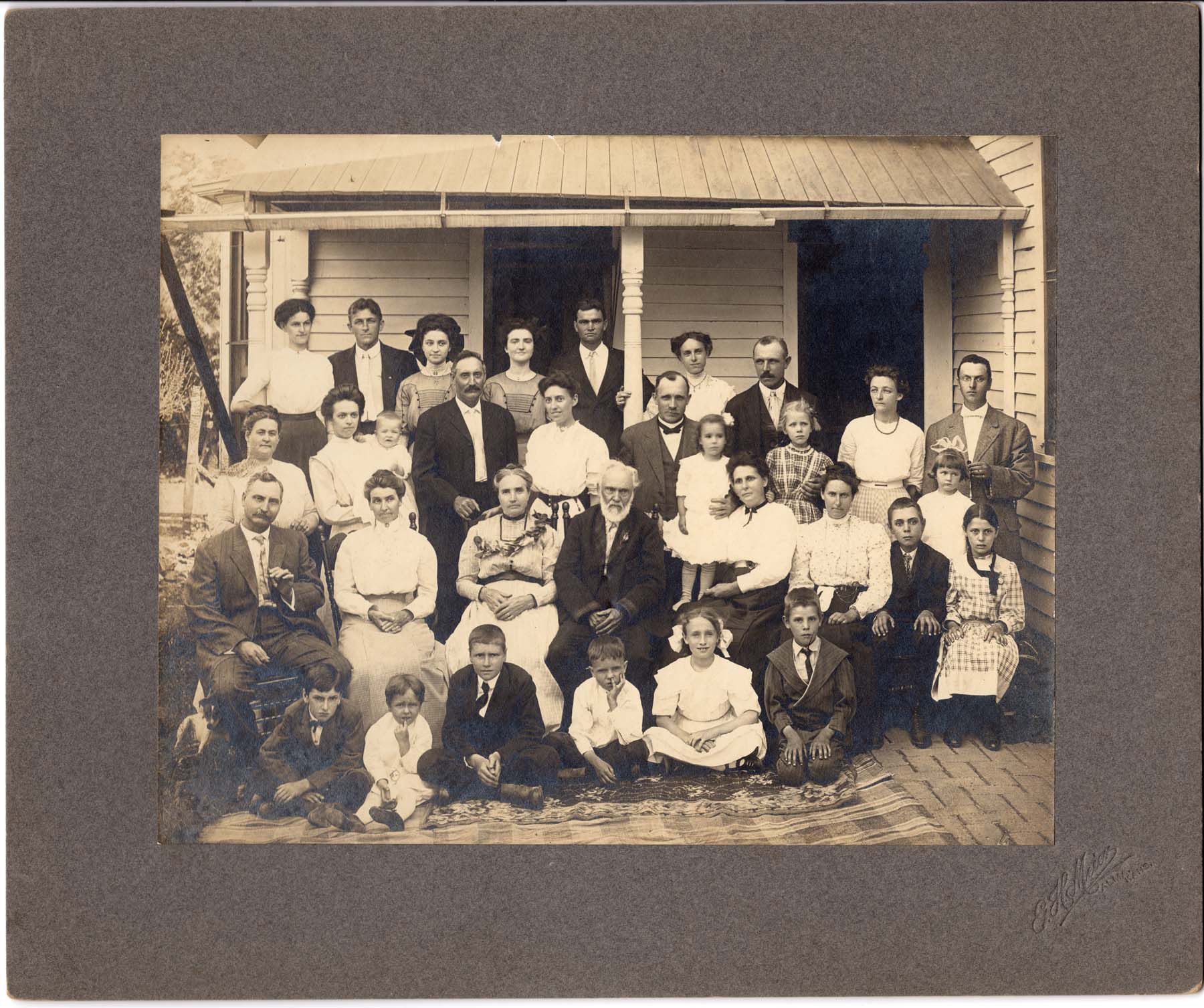 The family of Joseph and Augusta Thoes, seated center, pose for this Gus Meier photograph taken at their Alma home on June 9, 1911.