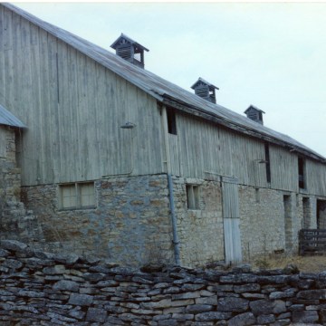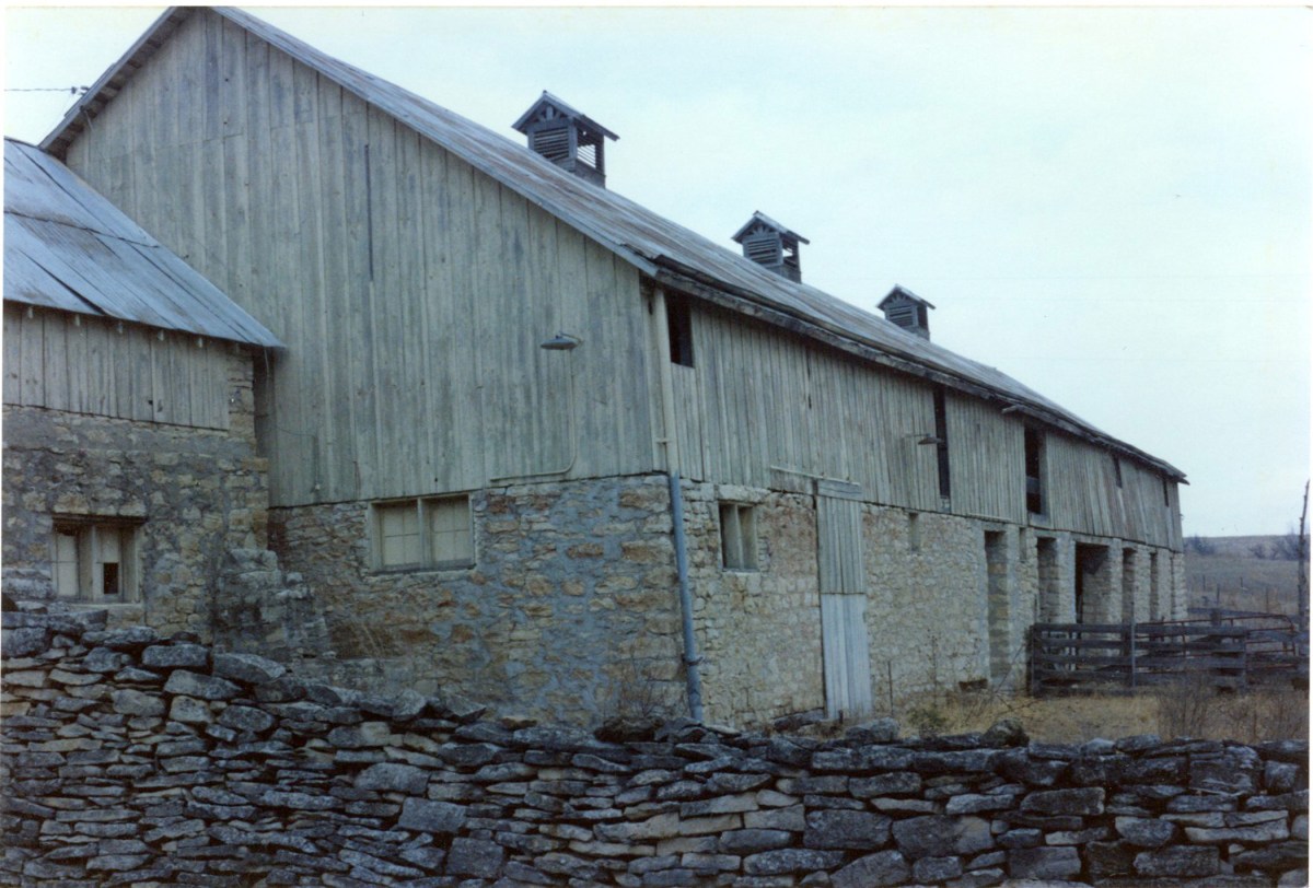 This late 1980s view of the Peter Thoes barn looks at the south face of the bank-barn.