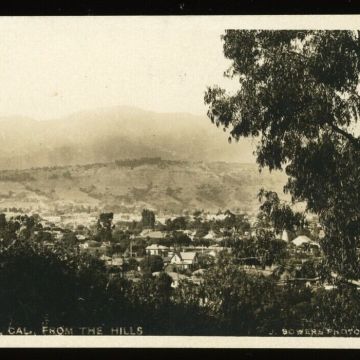 This panoramic postcard, titled Santa Barbara From the Hills, bears the imprint, J. Bowers Photo Co., Long Beach, Cal. and dates from about 1910.
