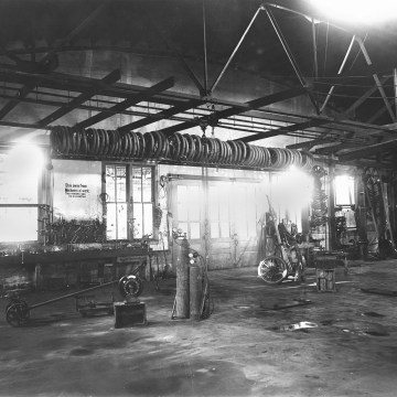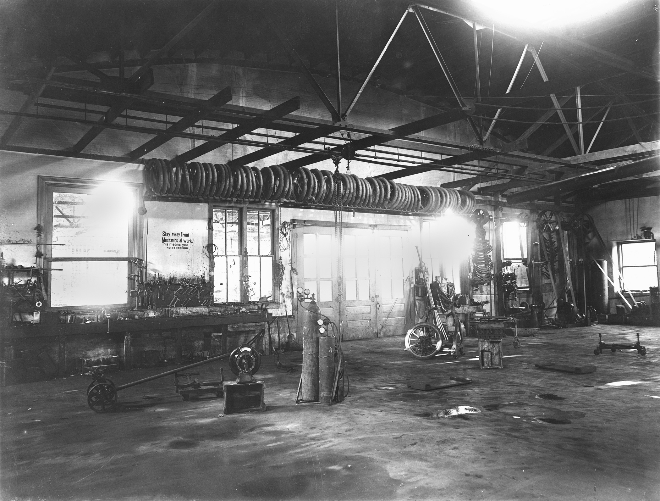 This interior view of the shop at Alma Tire and Battery Shop, located at 204-206 Missouri Street in Alma, Kansas was taken by Alma photographer, Gus Meier in 1925.