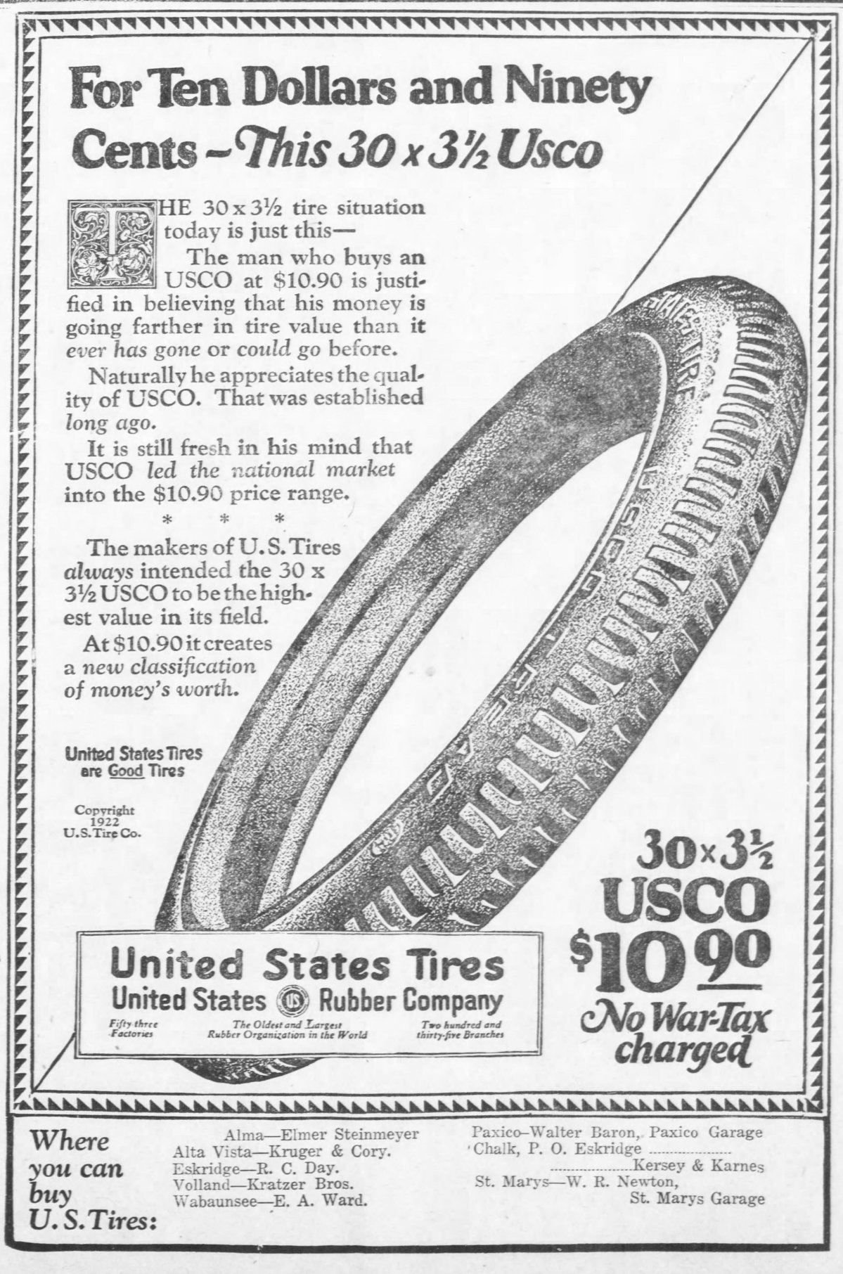 The Alma Enterprise, Friday, June 2, 1922 advertises United States Tires, offered for sale by Elmer Steinmeyer in Alma.