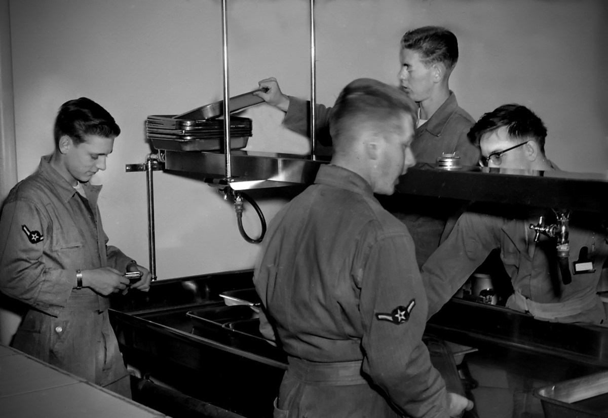 Dave mathias, far left, and other Air Force photographer trainees attend darkroom class at Lowery AFB in this 1956 photograph.