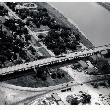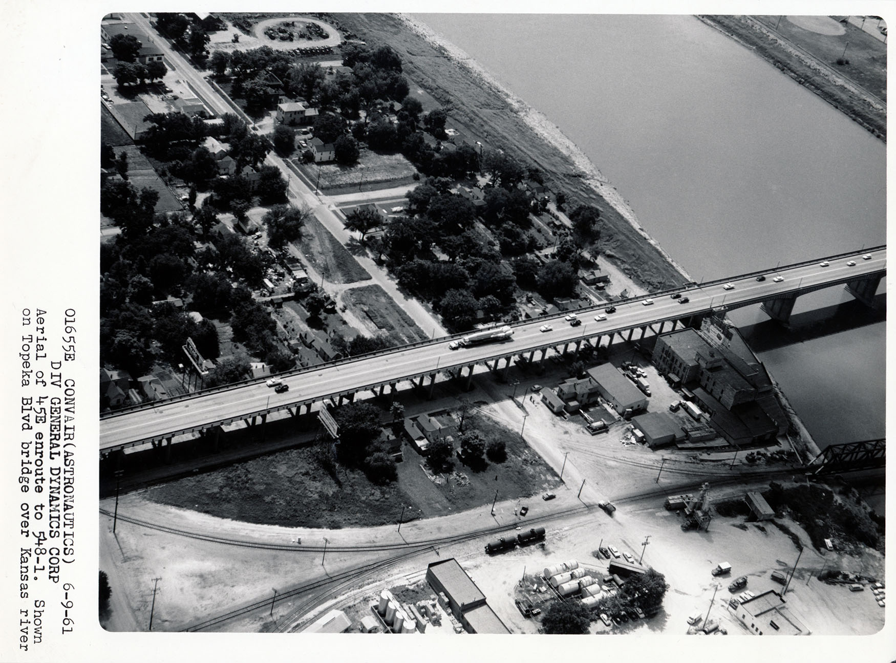 Dave Mathias took this aerial view of an Atlas missile crossing the Kansas River on the Topeka Blvd. bridge in Topeka enroute to its destination at Site #1, Rock Creek.