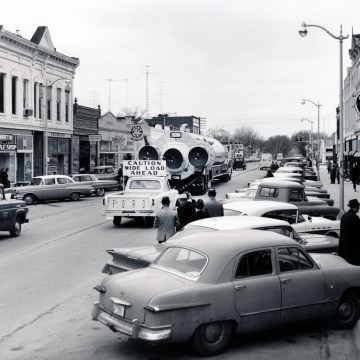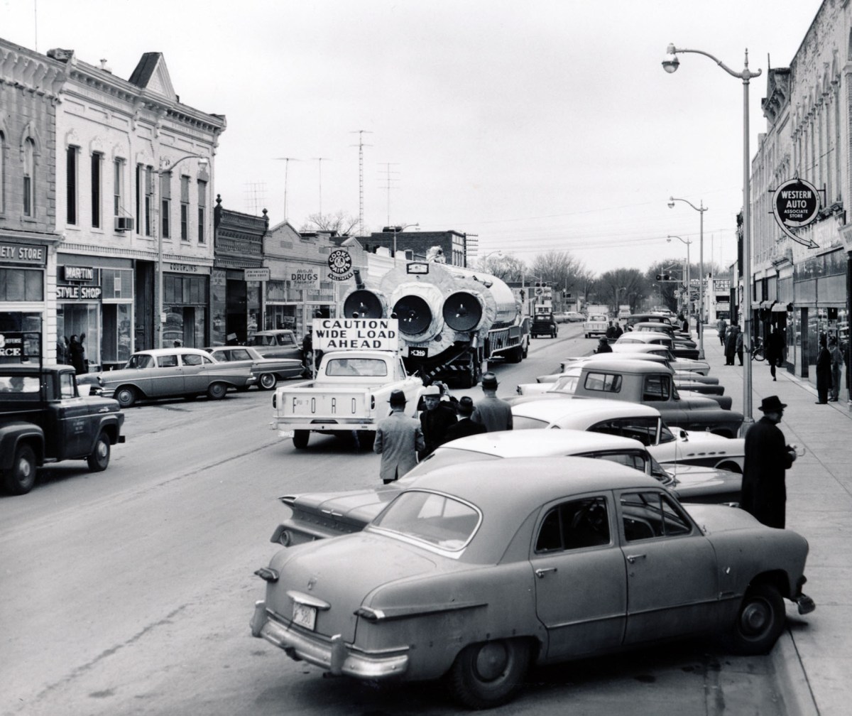 This 1961 view of an Atlas missile passing through Osage City, Kansas is one of the many photos Dave Mathias took of missiles being transported and installed in the launchers near Forbes AFB.