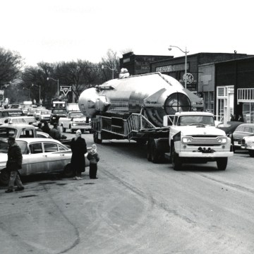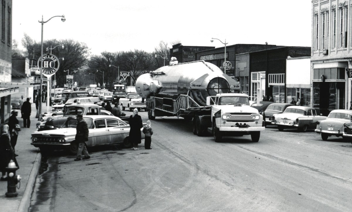 An Atlas missile passes through downtown Osage City on its way to Site No. 4, located near Burlingame in this 1961 view by Dave Mathias.