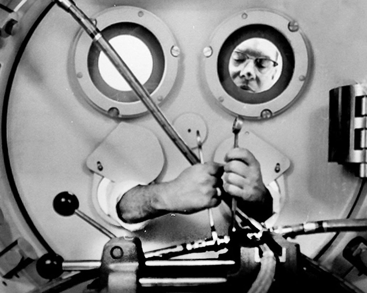 This award-winning photograph by GDA photographer Dave Mathias shows an engineer testing pneumatics. Mathias was inside the pressure tank when this 1961 view was taken.