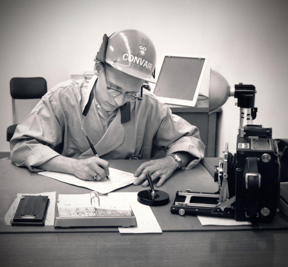 Dave Mathias completes paperwork in his GDA office at Forbes AFB in this view from 1961.