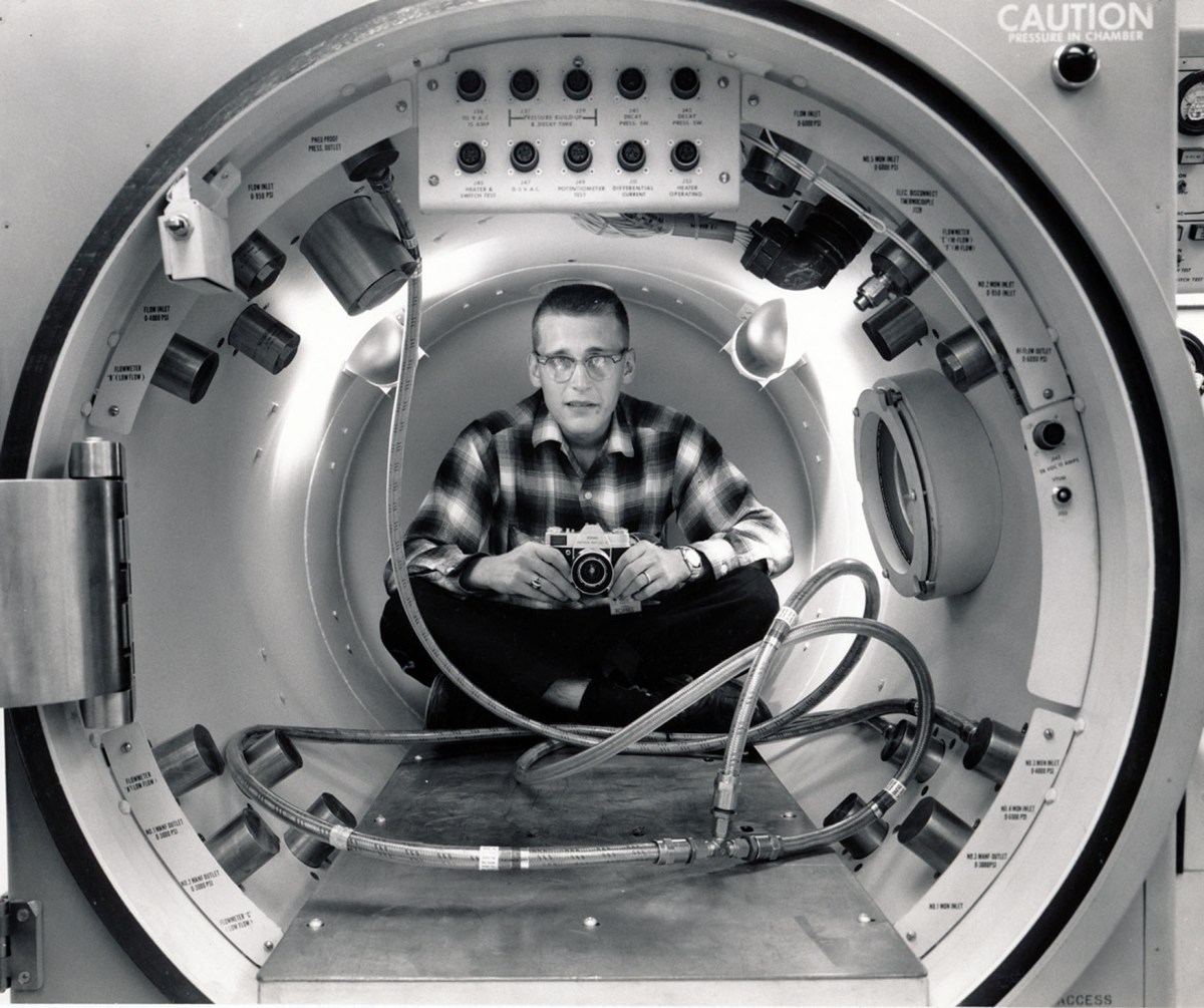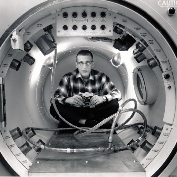General Dynamics Astronautics photographer, Dave Mathias positioned himself inside a 33-inch wide pressure tank to capture the technician’s image from the body of the tank.