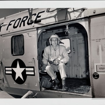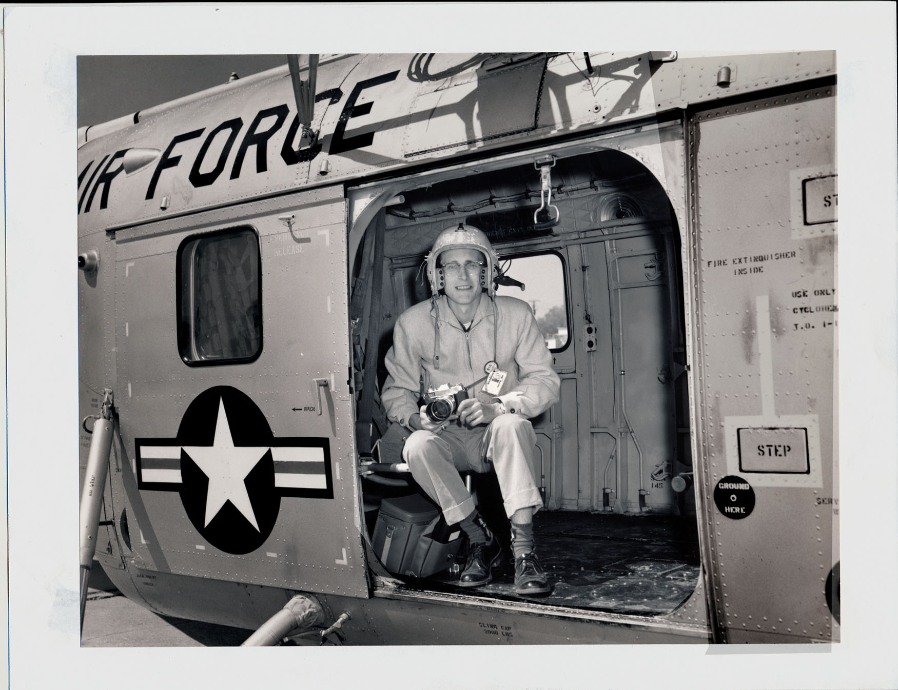 Dave Mathias sits in the side doorway of an Air Force helicopter at Forbes AFB as he goes on assignment photographing the base’s Atlas missile sites in this view from 1961.