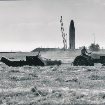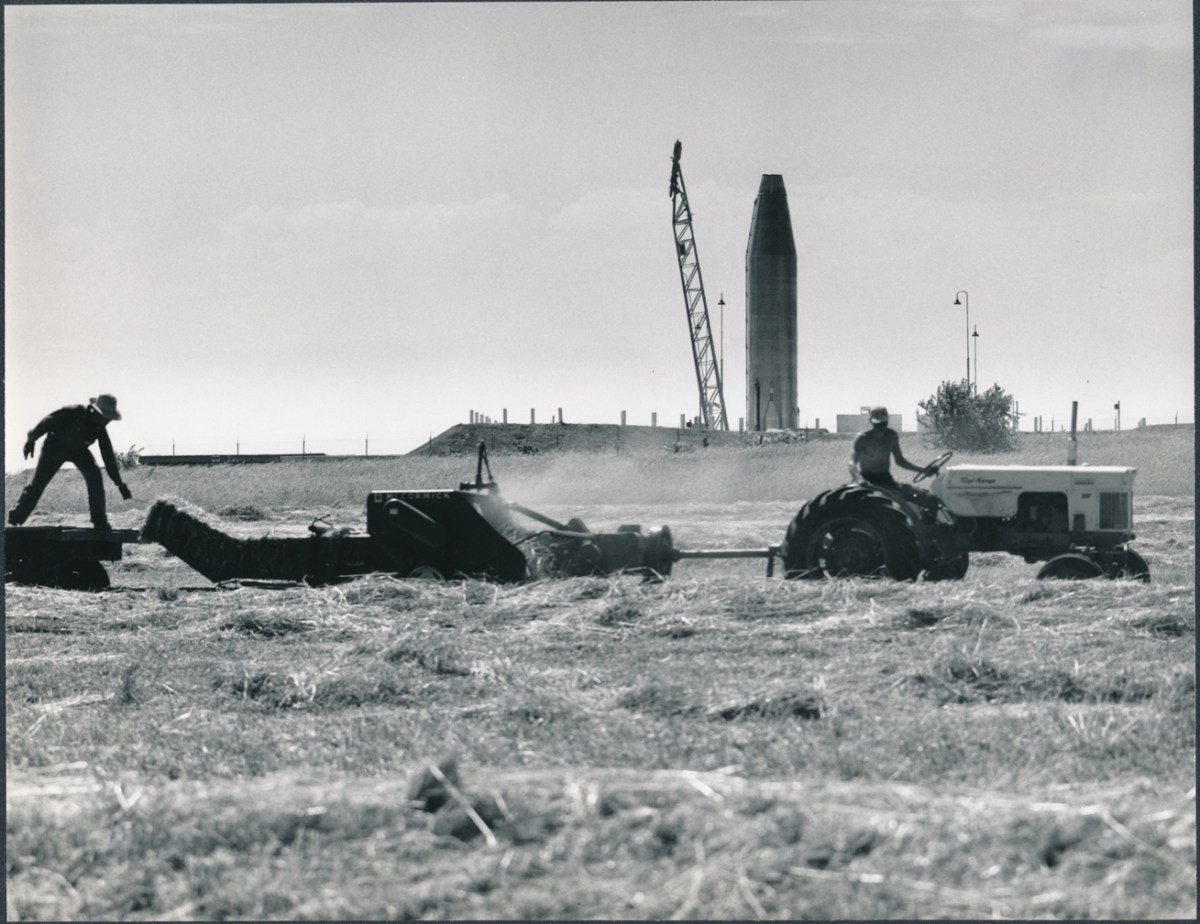 This view of two Kansas farmers baling hay with an Atlas missile erected in the background was taken in the summer of 1961 by Dave Mathias. This photo appeared in General Dynamics national corporate magazine.