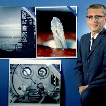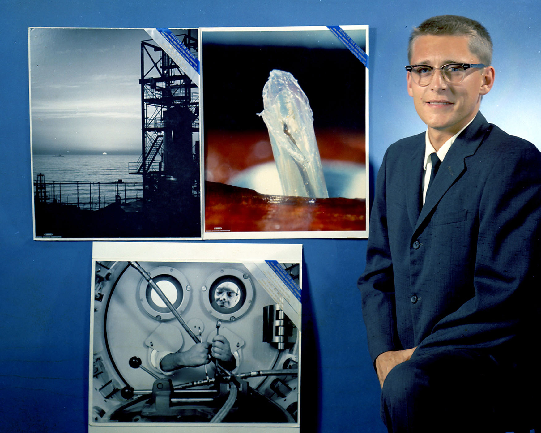 Dave Mathias stands beside prints of three award-winning photographs which he took while employed at General Dynamics Astronautics.