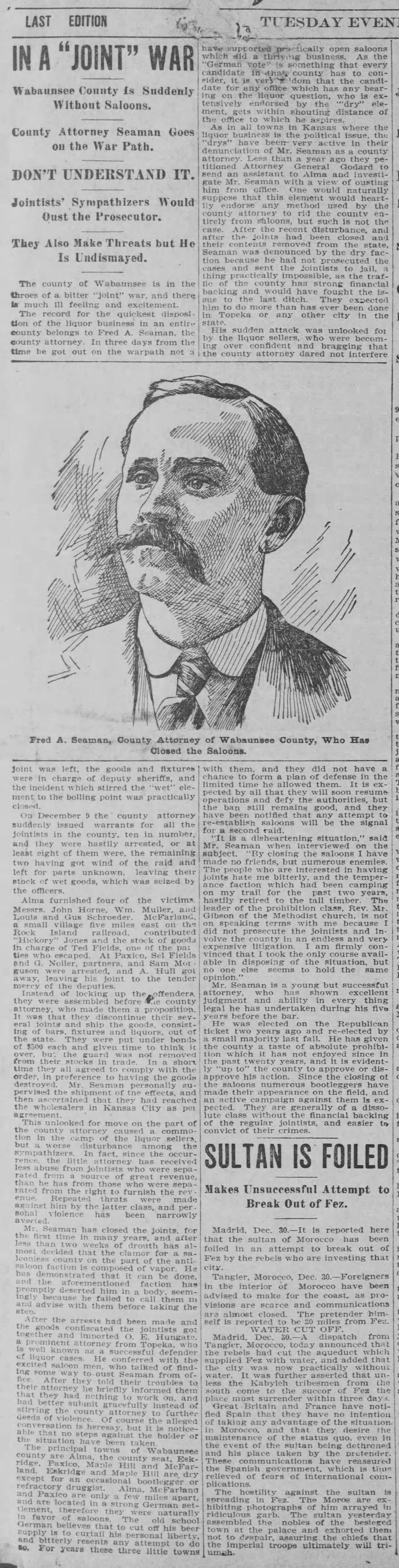 The Topeka State Journal of December 30, 1902 detailes the “Joint War” launched by Wabaunsee County Attorney, Fred Seaman.