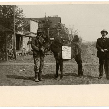 Two men pose in the center of Newbury Avenue in Paxico for this real photo postcard from Paxico, Kansas, circa 1905. The sign on the burro’s back says, “When may we three meet again? Born in Africa.” The man standing at the right, seems to be cradling a Winchester rifle with the barrel resting on the ground by his left foot. Both men are unidentified.