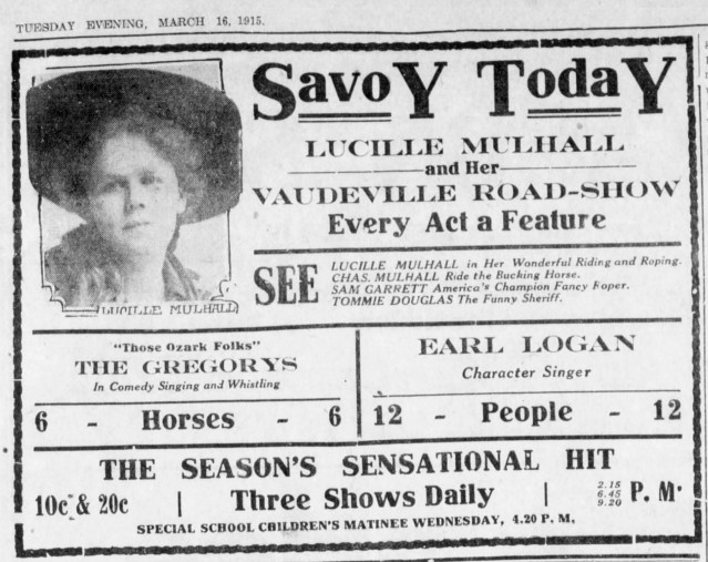The Shawnee Daily News Herald of March 16,, 1915 advertises the coming of Lucille Mulhall and Her Vaudeville Road-Show.