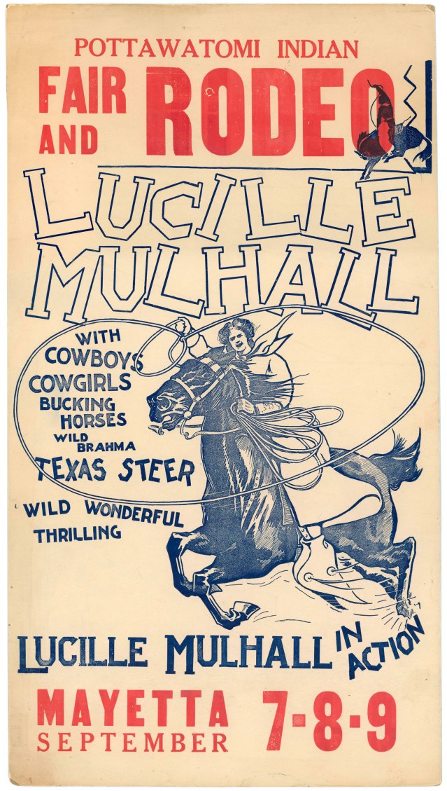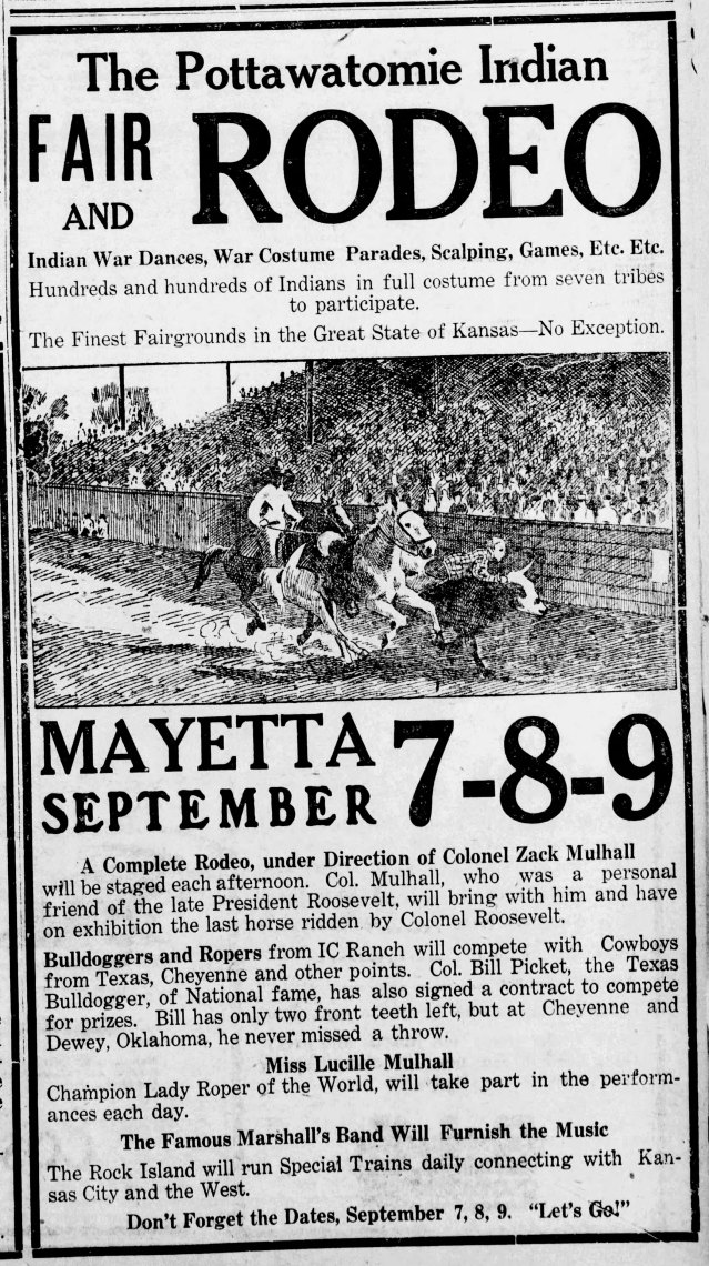 It isn’t clear who arranged the appearance, but on September 7th, 8th, and 9th of 1922, the Mulhalls returned to the rodeo arena at The Pottawatomie Indian Fair and Rodeo held on the Reservation at Mayetta, Kansas. The event featured performances by “hundreds and hundreds of Indians in full costume from seven tribes”, featuring “Indian War Dances, War Costume Parades, Scalping, Games, etc.” Advertisements for the event proclaimed “A Complete Rodeo under Direction of Colonel Zack Mulhall will be staged each afternoon.” The fair billing continues, “Miss Lucille Mulhall Champion Roper of the World, will take part in the performances each day.”