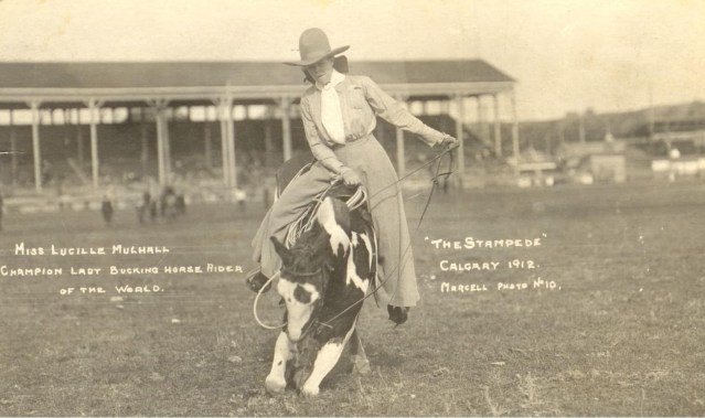 Lucille Mulhall performs for the crowd at the Calgary Stampede in 1912. Notice the divided riding skirt that the Colonel had specially tailored for his daughter.