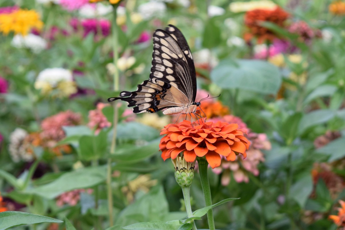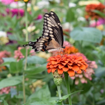 A Giant Swallowtail feeds on an orange Zinnia, a Benary Giant variety.