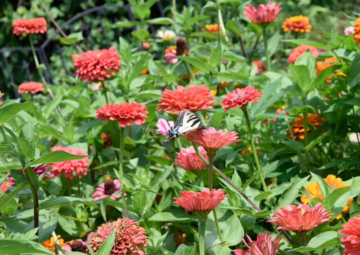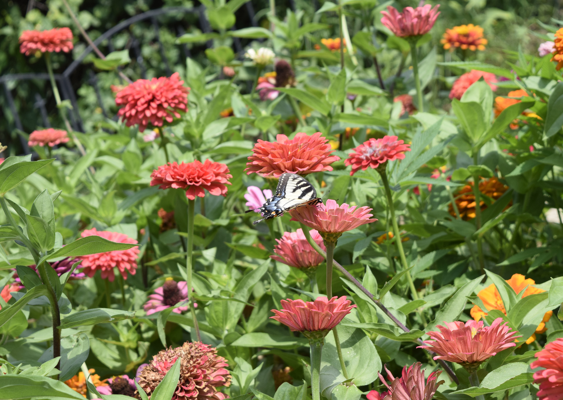 An Eastern Tiger Swallowtail feeds on a Zinnia on August 7, 2020.