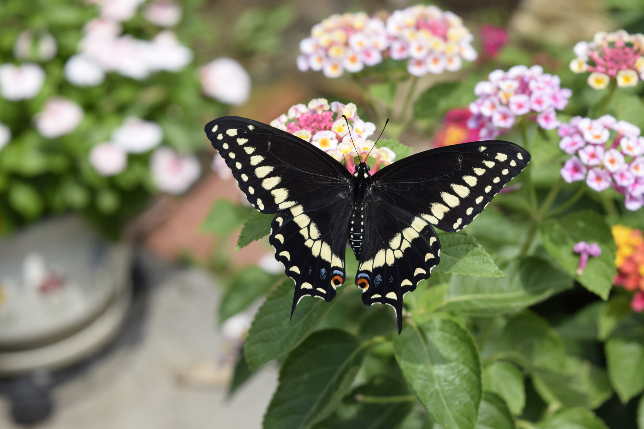 This Eastern Black Swallowtail butterfly, having only emerged from the pupa stage, feeds on a Lantana bloom before taking flight.