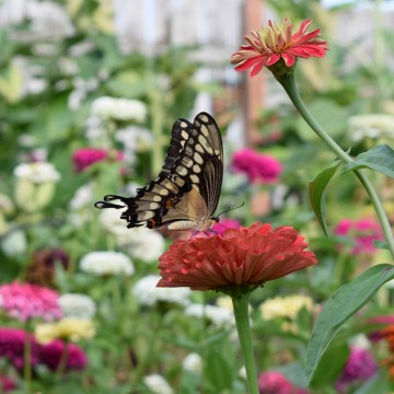 A Giant Swallowtail pauses to eat nectar from a giant Zinnia.