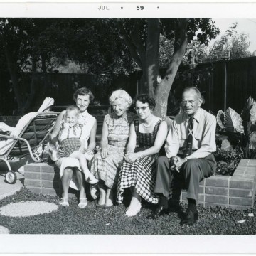Members of the Palenske family gather at Chuck and Rita Faulders’ home in Fullerton, CA. They include from left, Rita Faulders holding Peter Faulders, Lina Palenske, Florence Palenske, and Max Palenske.