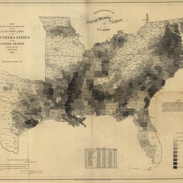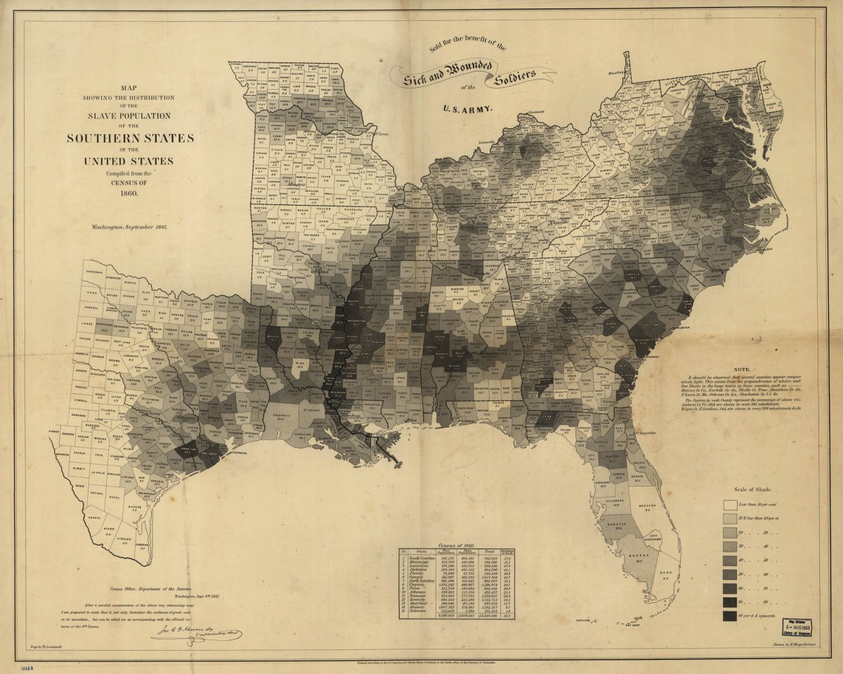 This map, titled, Slave Population of the Southern States of the United States bears a date of September, 1861. It specifies the percentage of slaves in every county.