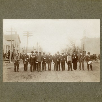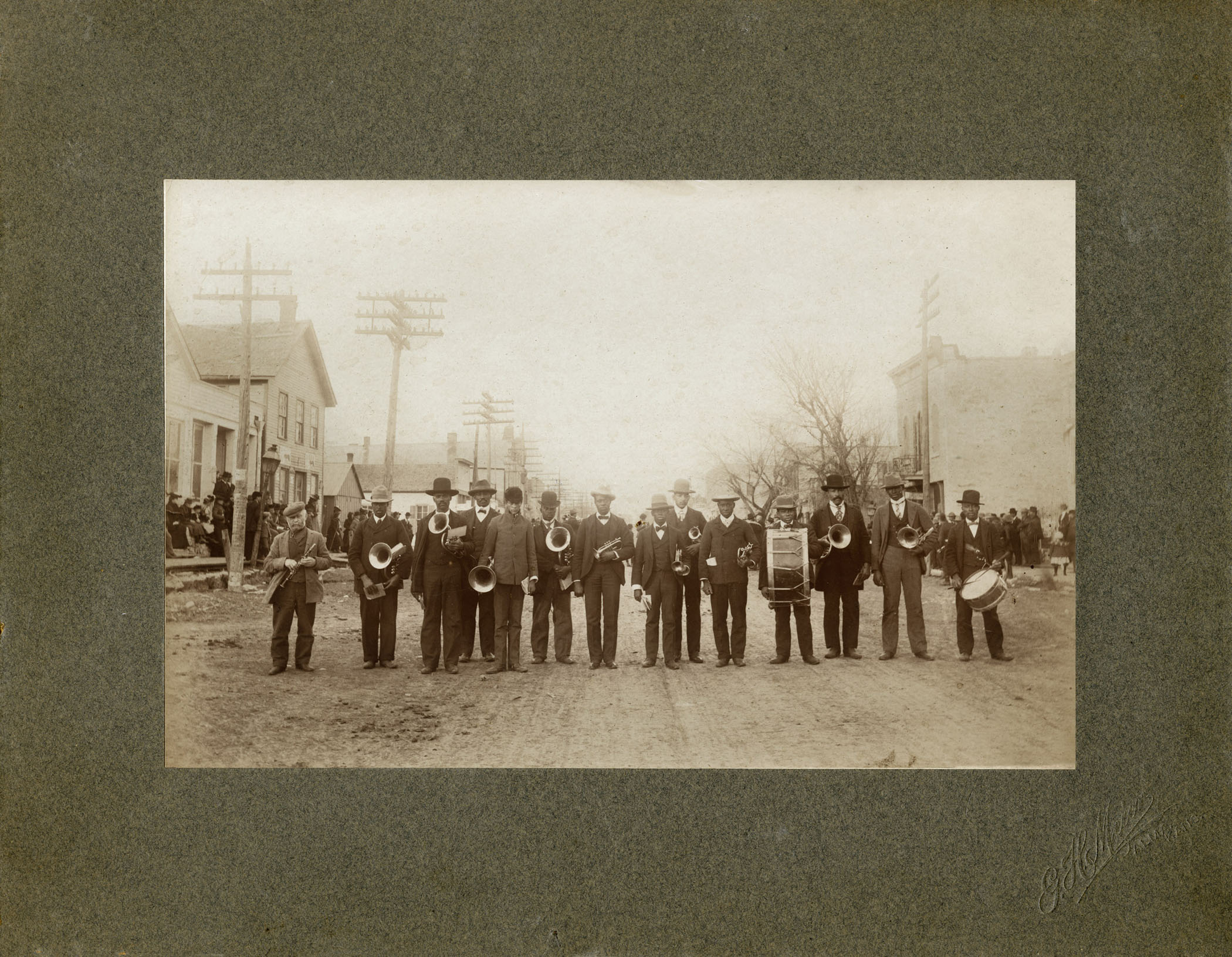The African-American band from Alma are seen here in the 200 block of Missouri Street. Identified from left are, Ferd Herrmann, Sally Wallace, John Goodpasture, Bill Goodpasture, Freddie Owens, Tom Wallace, Pickwith McDonald, Sam Bennett, Jim Cruthers, Roy Wallace, Jessie Davis, Bill Cruthers, John Holford, and Buddy Gardenhire.