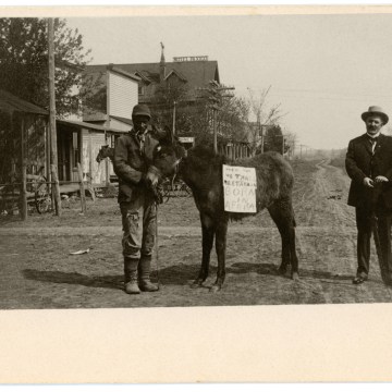 In this real photo postcard from 1906 a Black man leads a donkey with a sign, saying Born in Africa. A white man with a rifle stands at the far right.
