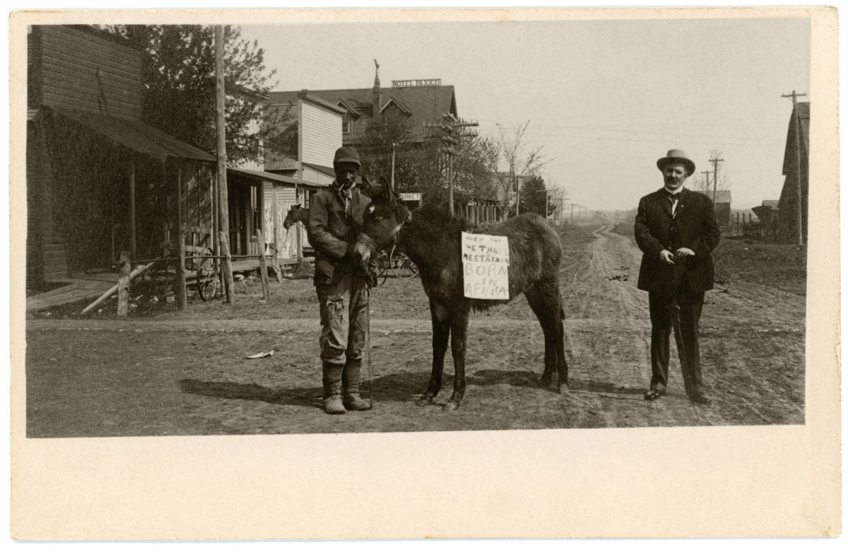 In this real photo postcard from 1906 a Black man leads a donkey with a sign, saying Born in Africa. A white man with a rifle stands at the far right.