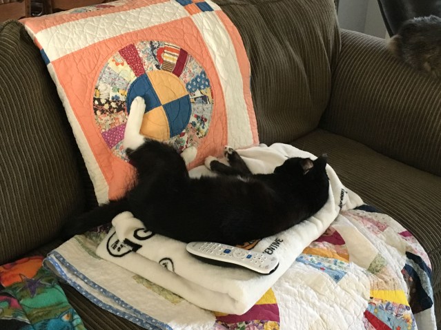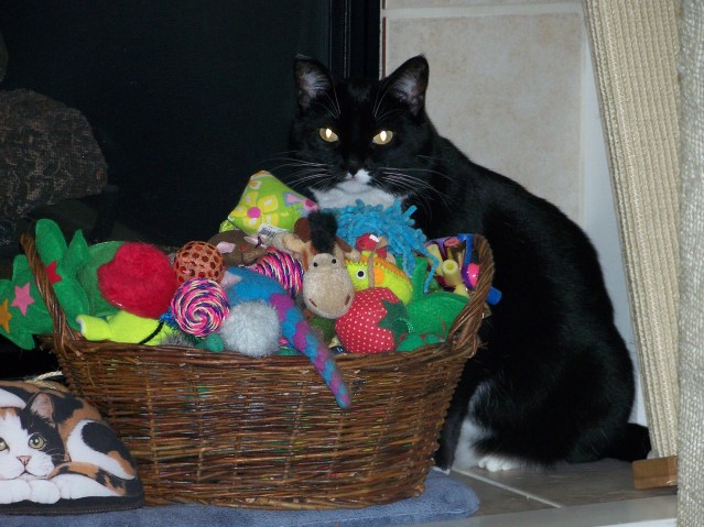 I heard a noise at the doorway, and I could see one of the resident cats with its eyes and nose to the bottom of the door, straining to see the intruder.  Inside the room, Baby Sox paid no attention at all to the other cats, focusing entirely on interacting with Cheryl and me.  By the end of the weekend, we had decided that this eight-year-old cat had earned a place in our home and our hearts.  Cheryl returned the shelter’s cat-carrier and completed the adoption papers on Sunday.