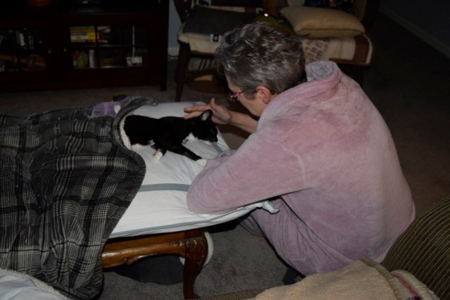 Whenever Cheryl or I were ill or injured, Baby sensed the situation and established a vigil beside us, only leaving briefly for a visit to the litter box and food and water bowls.  She would immediately return to resume her place beside us.  I had been injured just a handful of weeks before Baby passed away, but she chose to spend her final days at my side.
