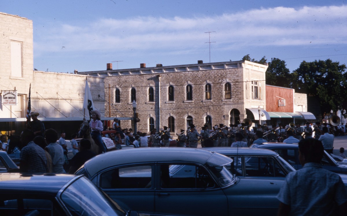 Alma, Kansas hosts the annual 4-H parade during the County Fair. in this view from the 1950s a band is seen marching through the intersection of 3rd and Missouri Streets. Ahead of the parade is a lady on horseback with a banner on the horse’s flank that says Eskridge Rodeo Queen.