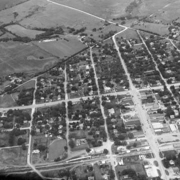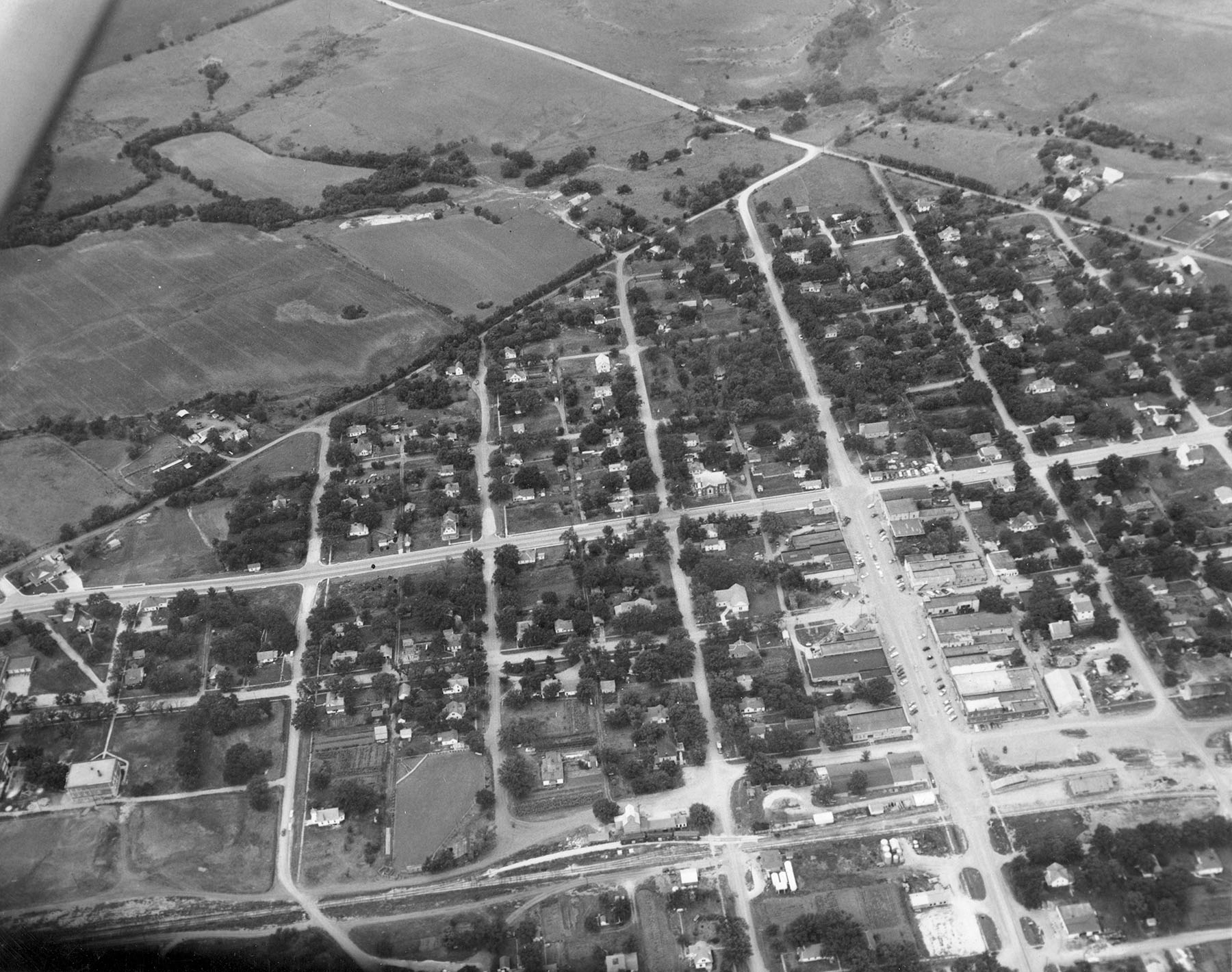 This aerial view of Eskridge, Kansas was taken by Eskridge businessman and pilot, Dean Dunn. This view, from about 1960, provides an excellent illustration that the town was platted at a 45-degree angle relative to the section lines. The Atchison, Topeka & Santa Fe tracks are visible horizontally across the bottom of the photo. Photo courtesy the Dean Dunn collection.