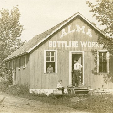 The Alma Bottling Works, located in the 1000 block of Ohio Street in Alma, Kansas, was purchased by James and Dora Barger in 1908, shortly before the photo for this real photo postcard was taken. The Bargers are seen here with their son, Norman.