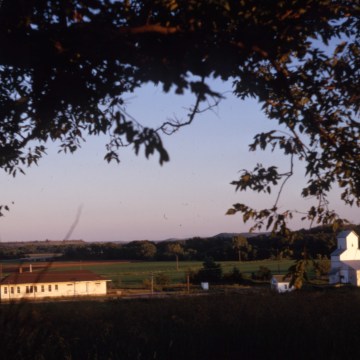 The Rock Island depot, left, and the Alma grain elevator are viewed from the west in this Charles Herman photo. In the distance one can see the Mill Creek bridge over Kansas Highway 99.