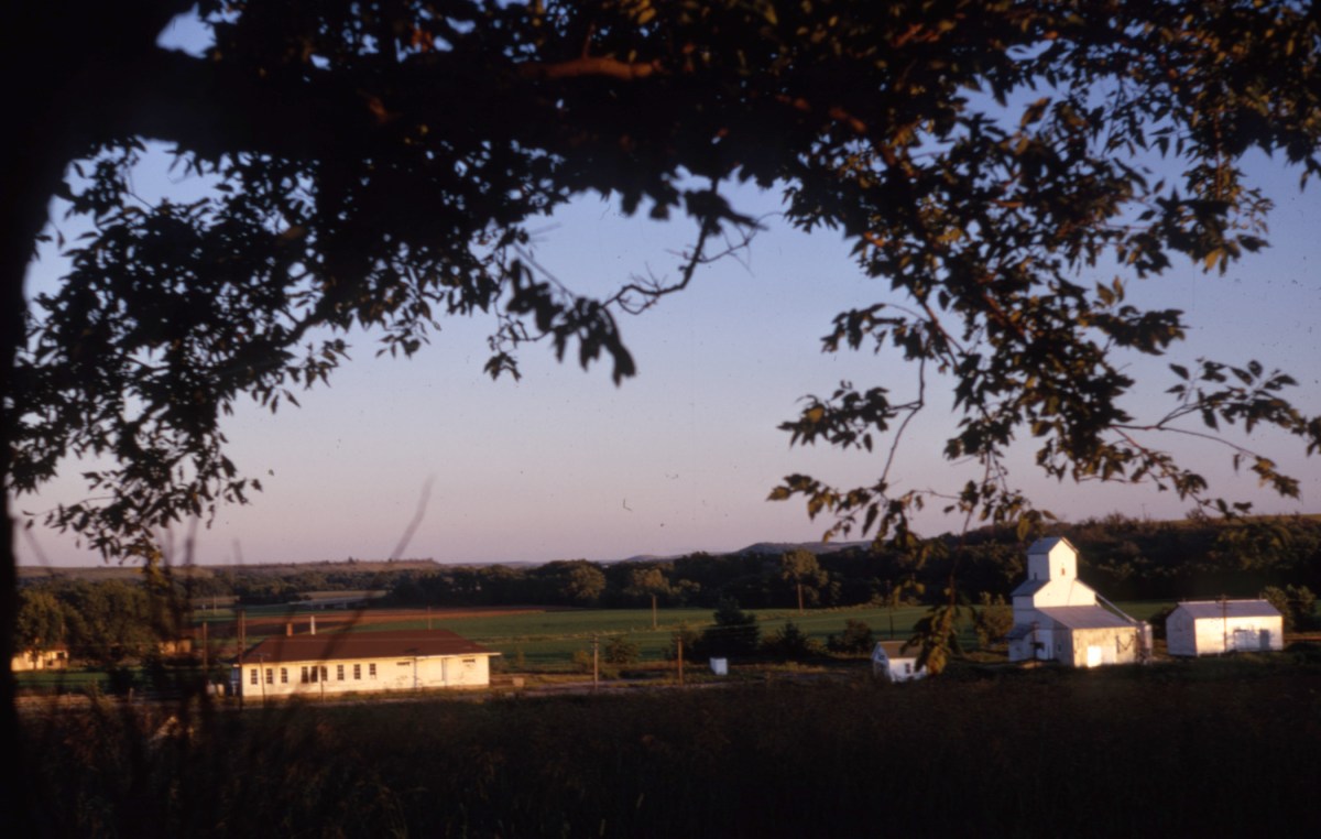The Rock Island depot, left, and the Alma grain elevator are viewed from the west in this Charles Herman photo. In the distance one can see the Mill Creek bridge over Kansas Highway 99.