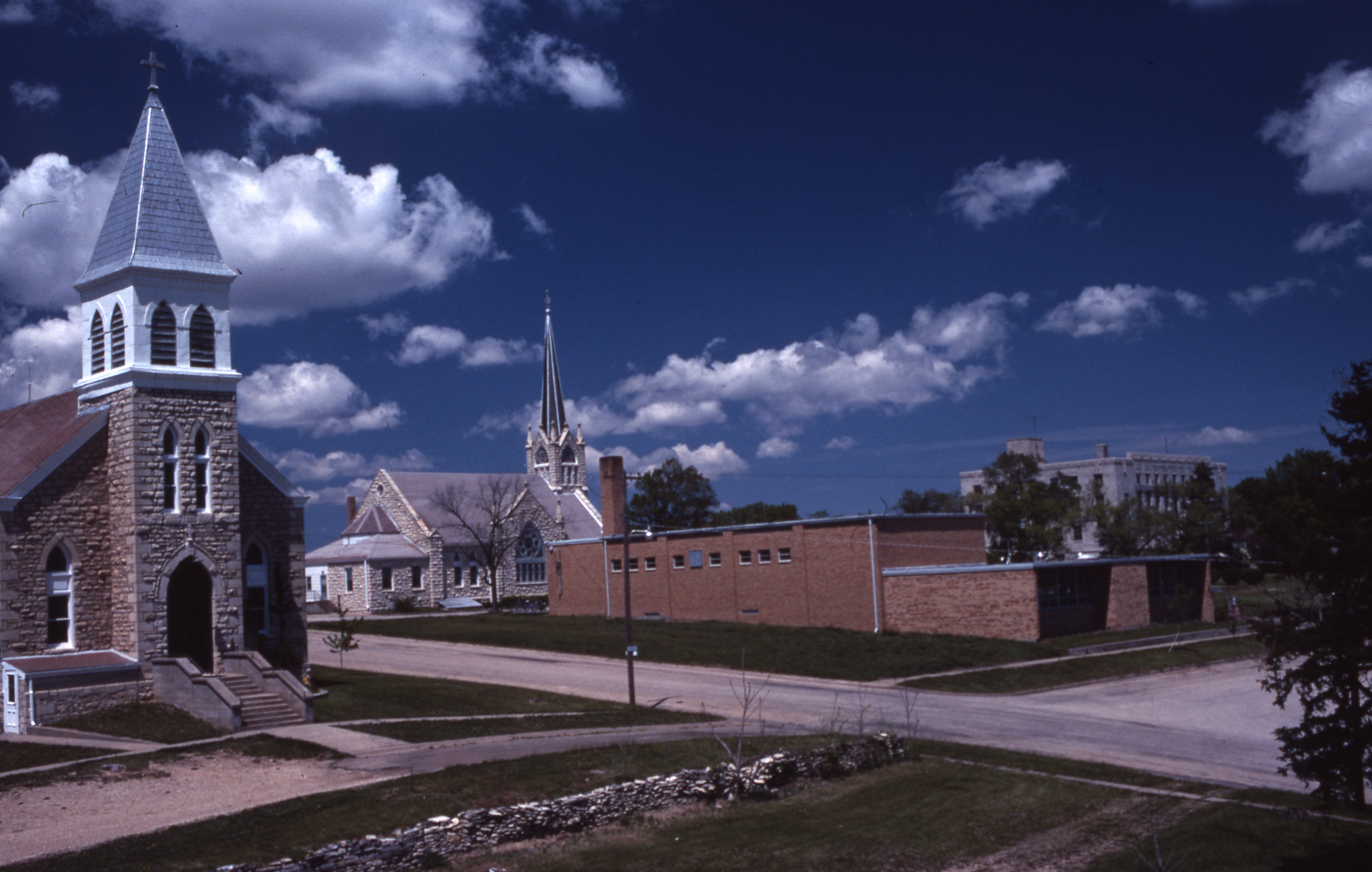 This Charles Herman photo of the Holy Family Catholic Church, St John Lutheran Church and St. John Lutheran School in Alma features Herman’s trademark blue skies and puffy white clouds.