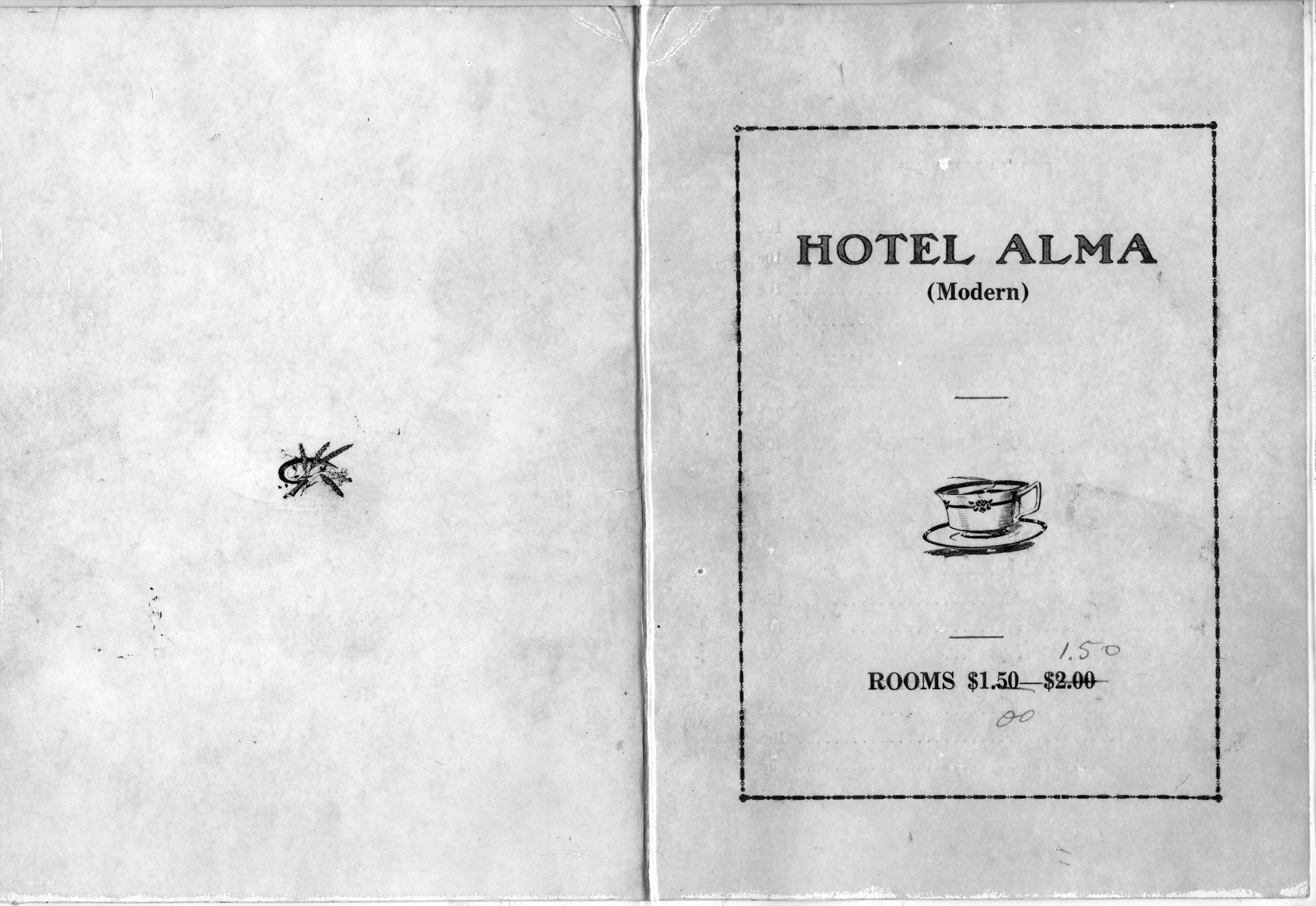 This front cover of a menu from the Hotel Alma shows rooms reduced in price from $1.50-$2.00 to $1.00 and $1.50. Menu courtesy Ervan Stuewe.