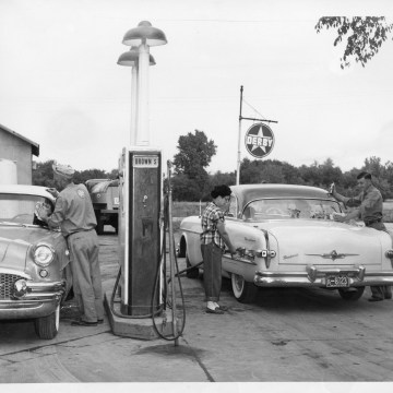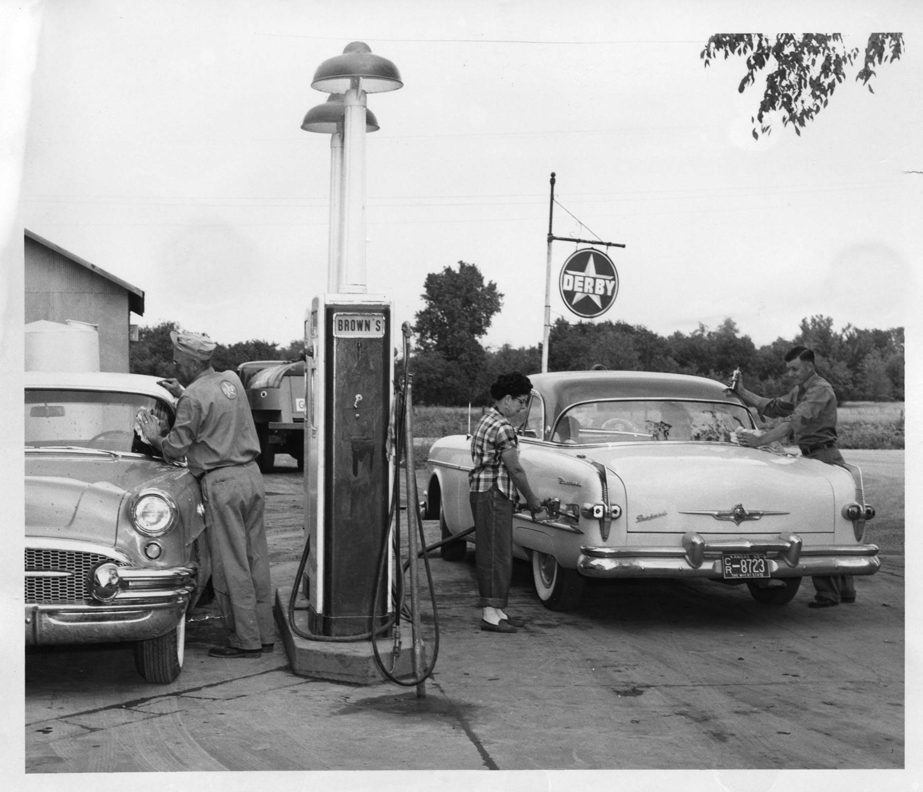 In this photograph dated October 30, 1955 Ross Brown, left and Marie and Paul Brown are seen fueling and servicing cars at their service station in Harveyville. Ross Brown opened the station on October 25, 1941.