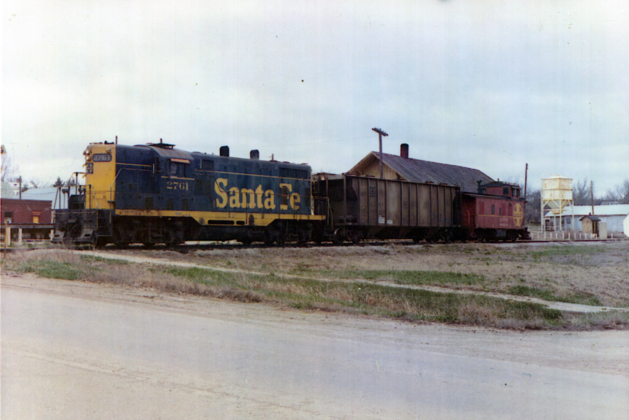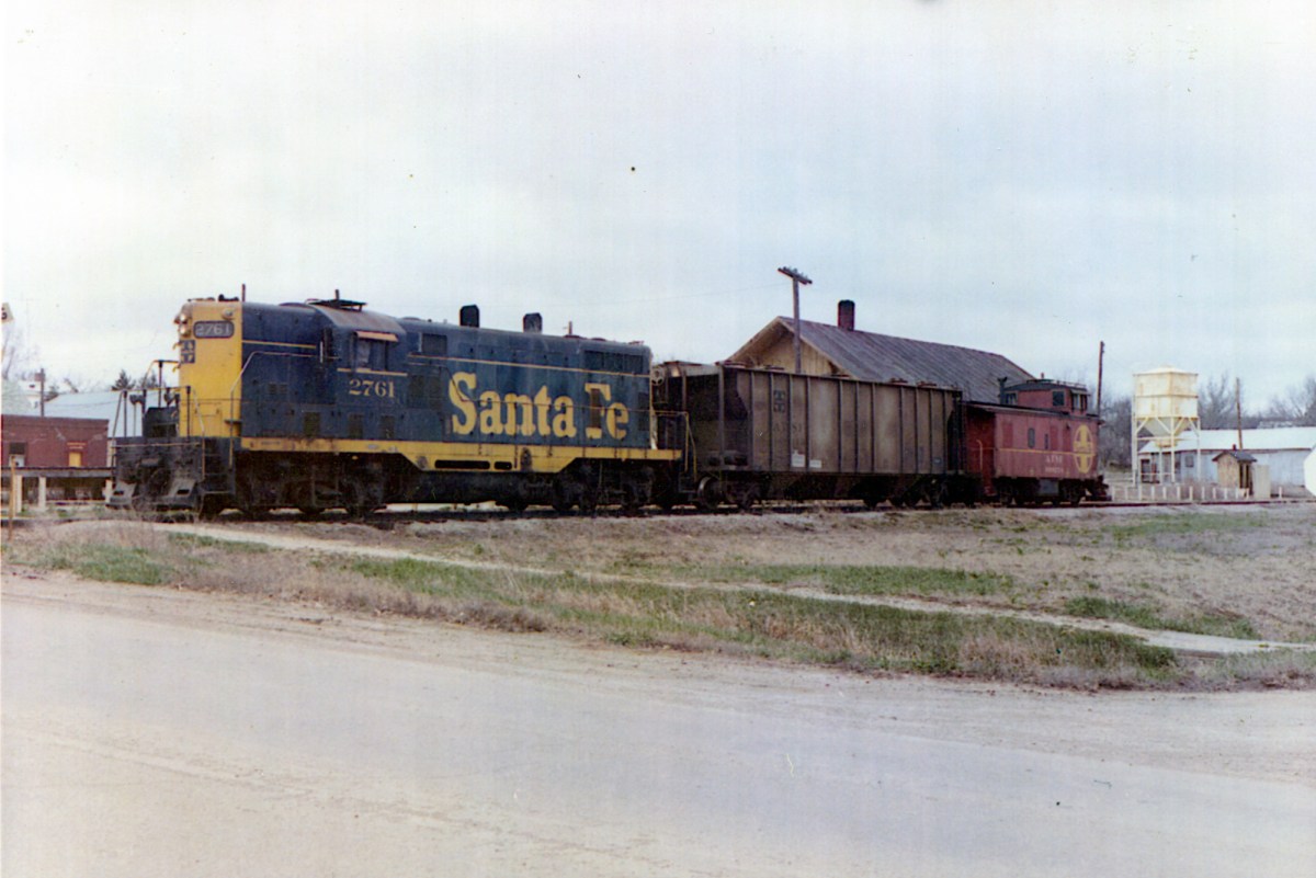 Dean Dunn waited at the Atchison, Topeka, & Santa Fe depot to take this 1972 photograph of the last train departing the Eskridge, Kansas depot as the railroad line was discontinued.