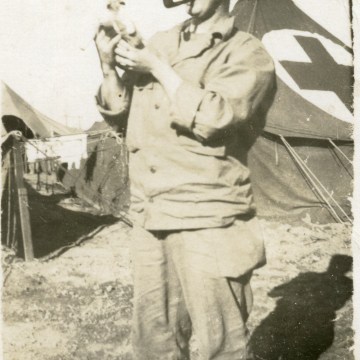 Daddy holds a pet rabbit he befriended at Anzio, Italy. This photo was taken on the Anzio beachhead on his 22nd birthday.